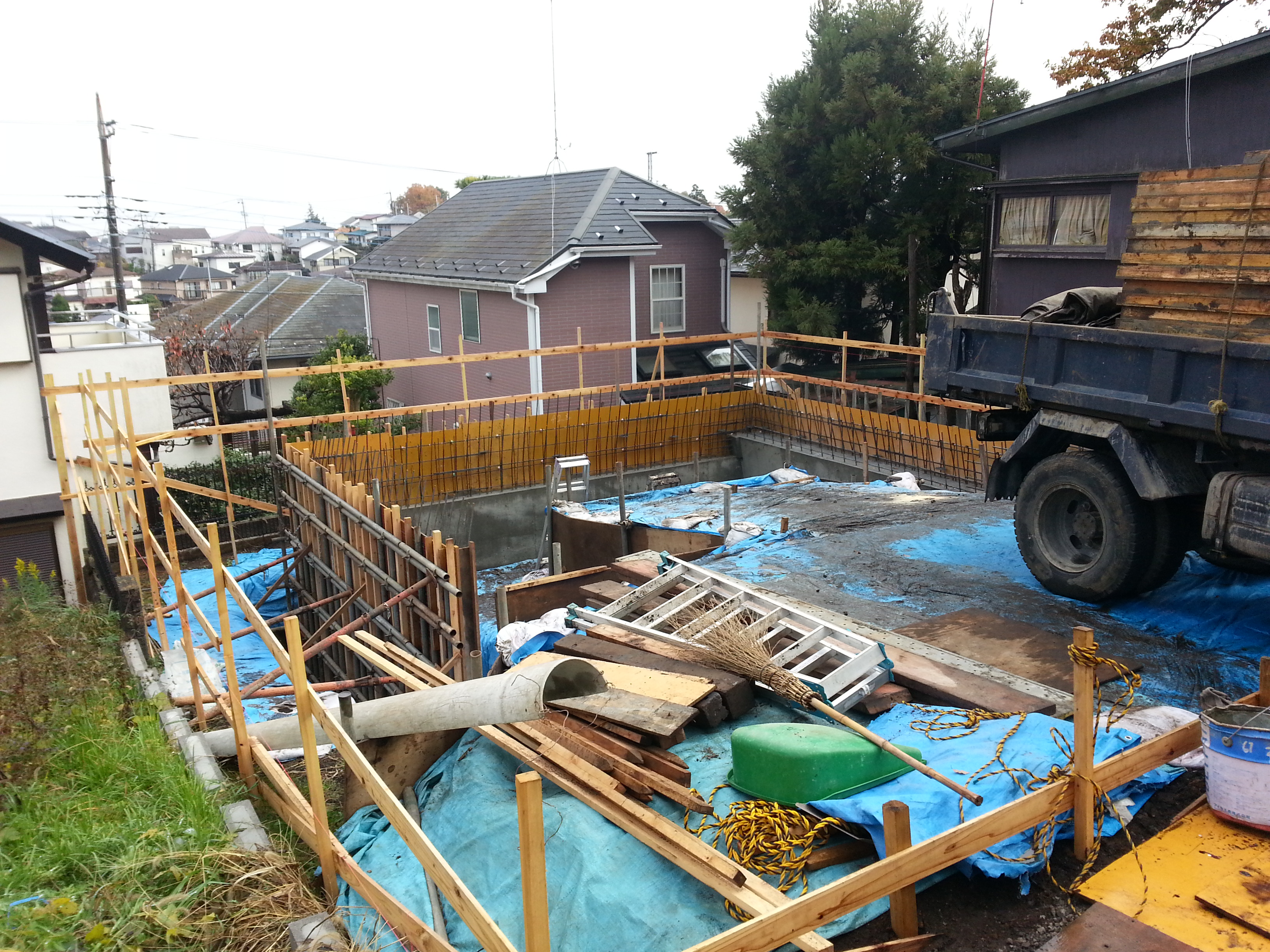 弊社、アーバンナチュール玉川学園の基礎工事ですが思っていたより大変です!多少の傾斜地ですので通常の基礎とたいして変わらず工事できると思っていましたがやはり高基礎、深基礎がからんでいますので大幅に工事期間が延長しています!しかしこれだけ頑強な基礎であれば安心ですね!年内には上棟までいきたい思っていますが建物にとって一番大事な基礎ですから慎重に工事を行っていこうと思ってます!