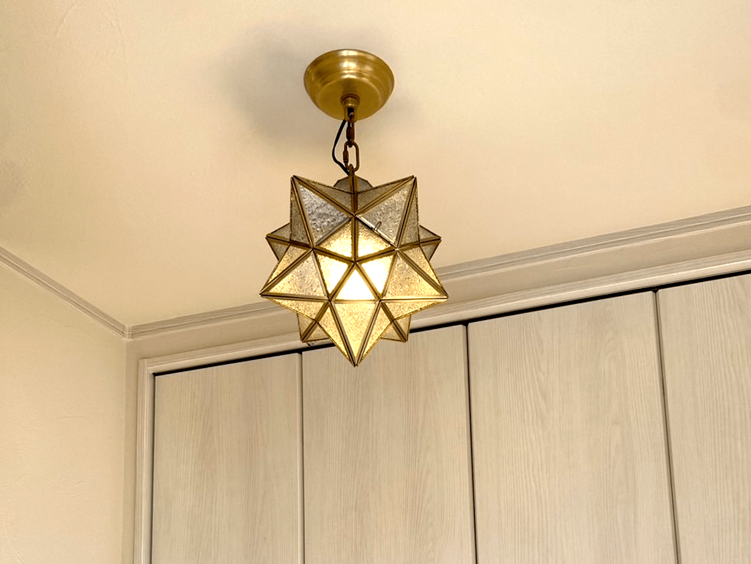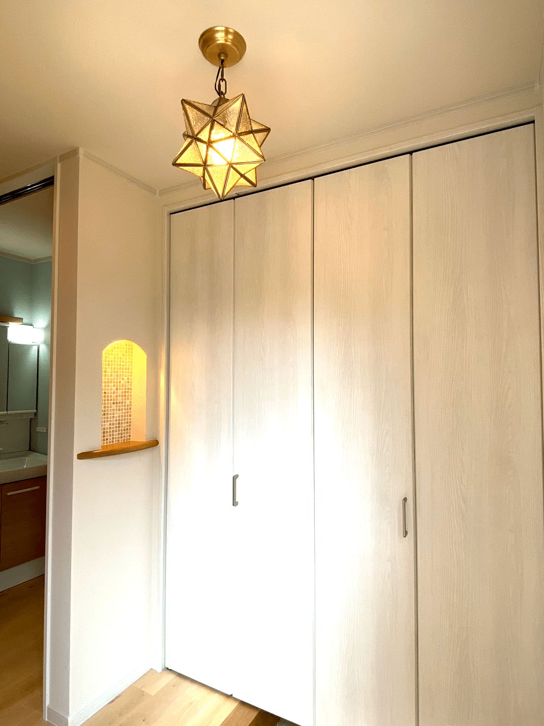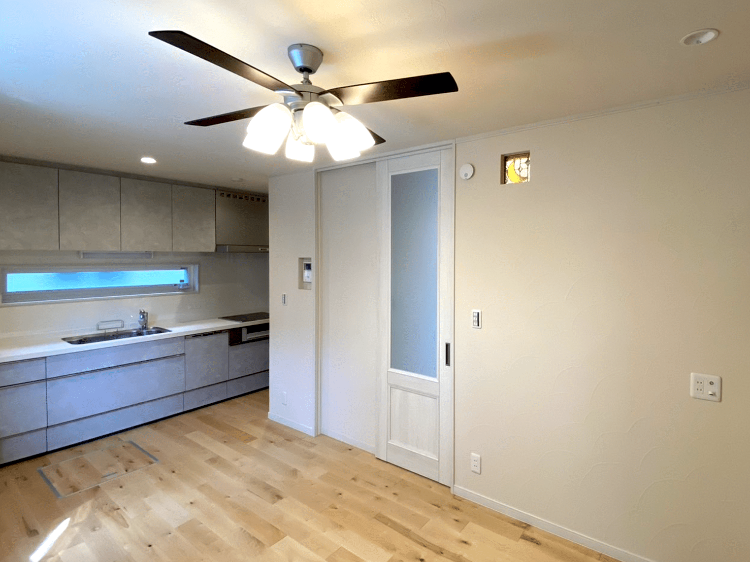 足元には、温かみのある無垢のフローリングを採用し、経年変化も楽しめます。こだわりのキッチンデザインと、空間を彩るおしゃれな照明が、居心地の良い雰囲気を演出。