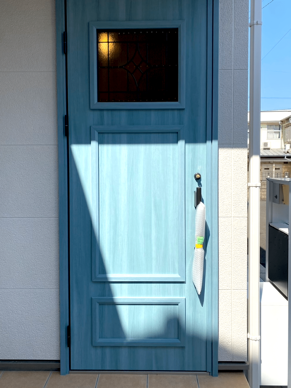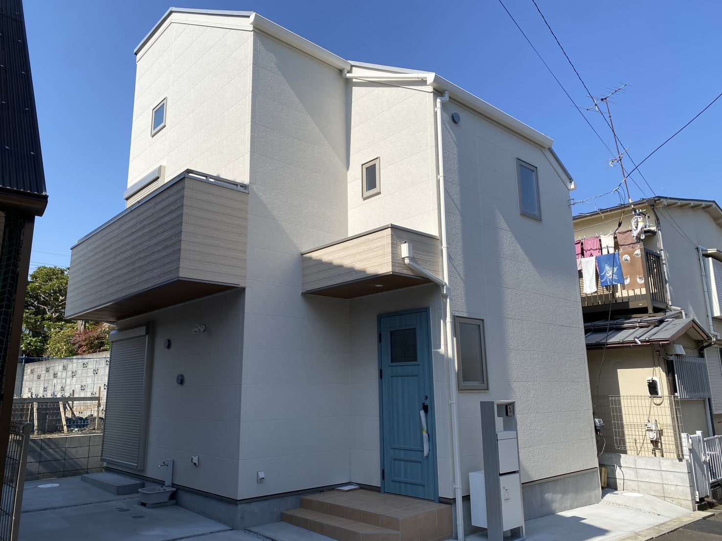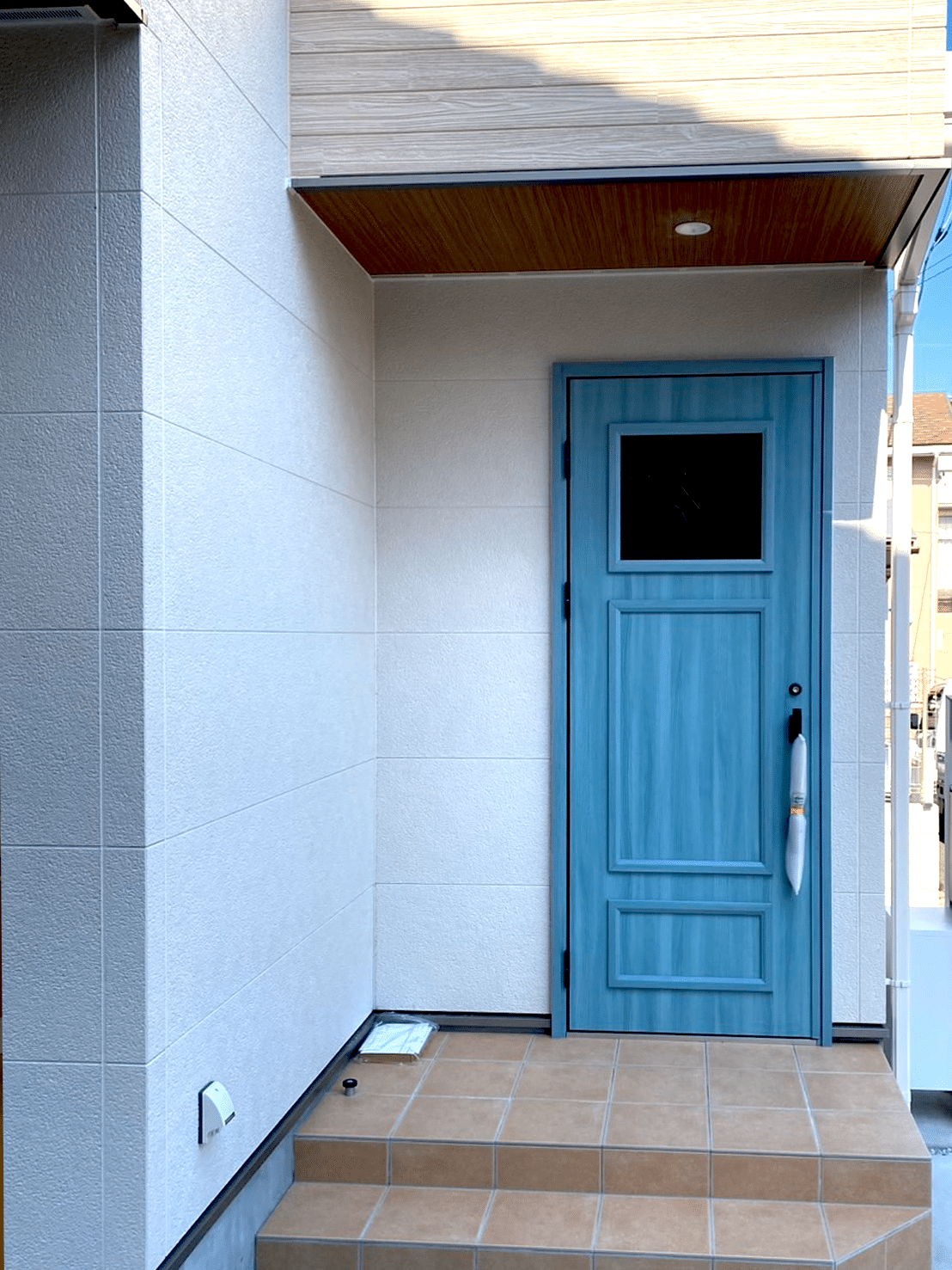 外観のアクセントとなる青い玄関ドアも、お客様のセンスが光ります。